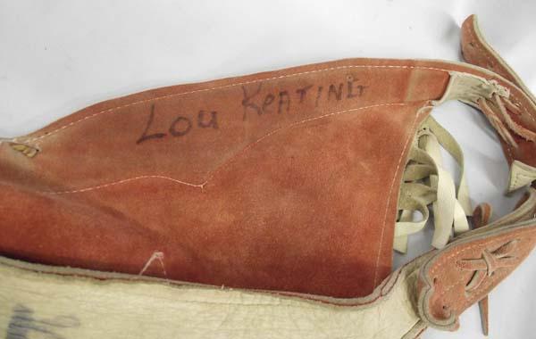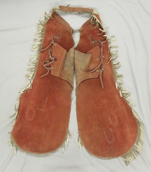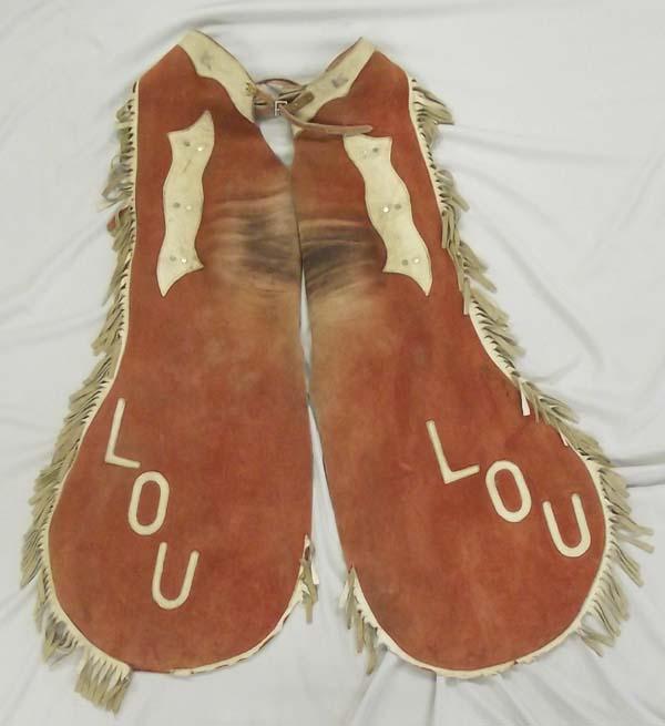 Suede Batwing Chaps owned by Lou Keating, rust colored with ivory colored fringe and has the leather letters LOU stitched on the bottom of the both legs, Lou Keating ran the Keating's Rodeo School in Peralta NM for 25 years and now lives in Denison Texas, inseam measures 31''. Buyers Pay Actual Shipping and Handling Charges(see terms and conditions for more information)