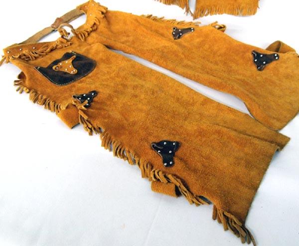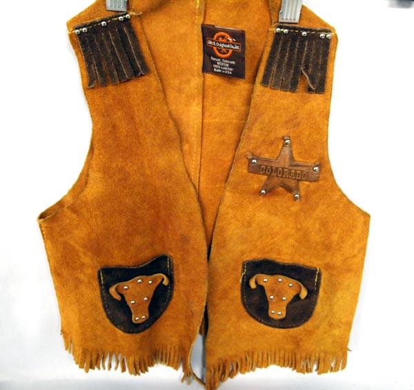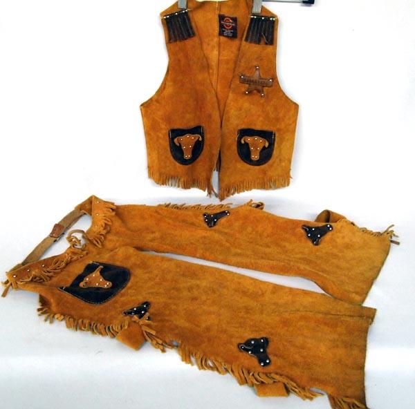 Suede Buckaroo Chaps & Vest, Colorado Leather Badge and has a pocket, size M, chaps length is 23" and waist measures 34" end to end. SHI $20.