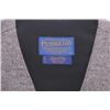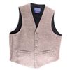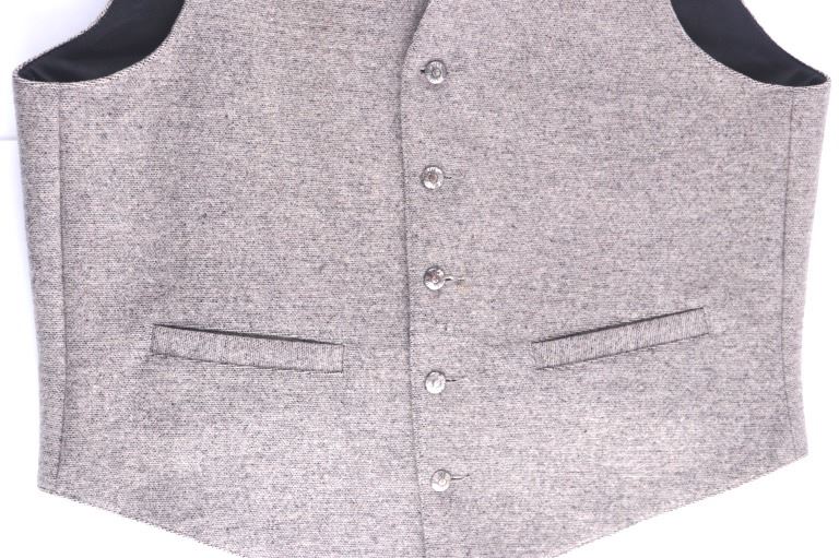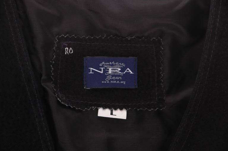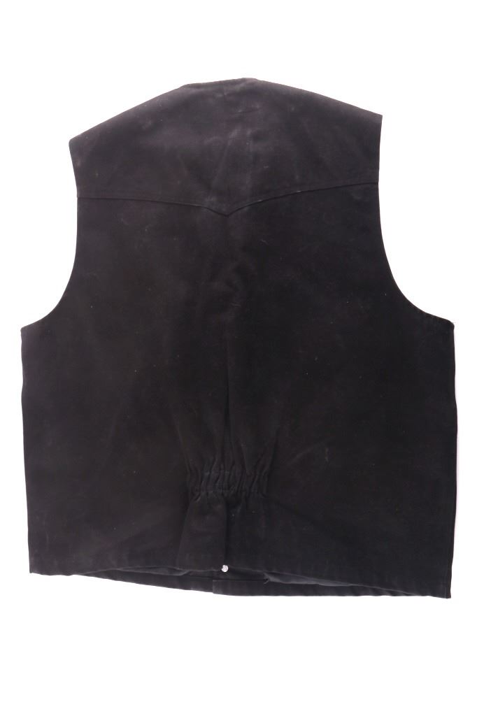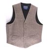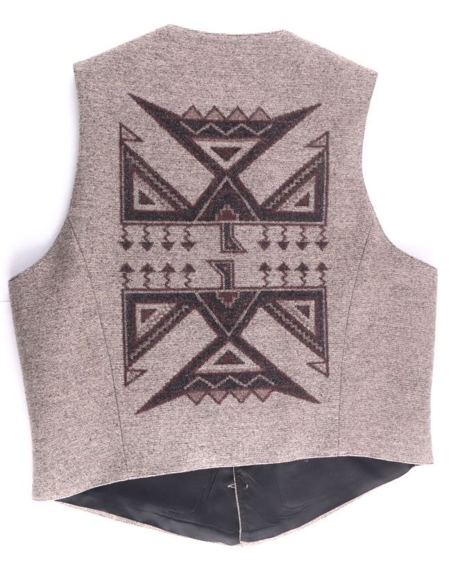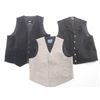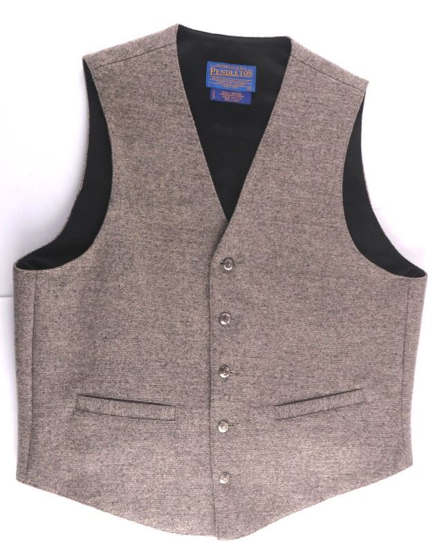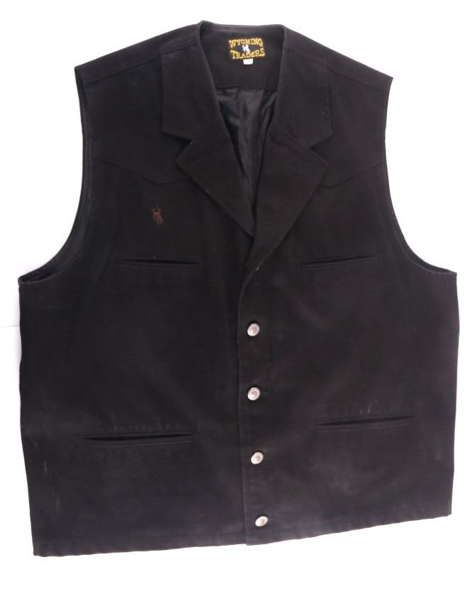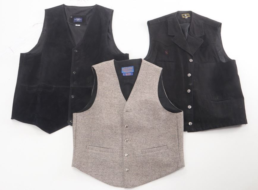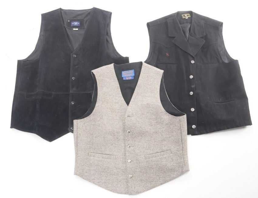 For your consideration in this lot is a collection of three men's vests. The first vest is constructed from Pendleton wool. This vest features grey flecked wool with a Thunderbird pattern in brown and black on the back. The vest has five silver buttons with Zia sun symbol. This vest is tagged size medium. The next vest is an authentic NRA gear vest. This vest is made of black suede with a snap closure front. There are two inside pockets, one on the right and one on the left. The CC pockets are large with hook and loop closure and have a protective lining. This vest is tagged large but has a very generous cut to it. The last vest in the collection is a Wyoming Traders 100% cotton canvas vest. This vest has a western yolk cut and 5 metal buttons with Wyoming Traders and the cowboy and bucking bronco mark. The cowboy and bucking bronco is also stitched over the right breast. This vest is marked size XL. All three of these vests are in good condition and show light wear and creasing from storage.