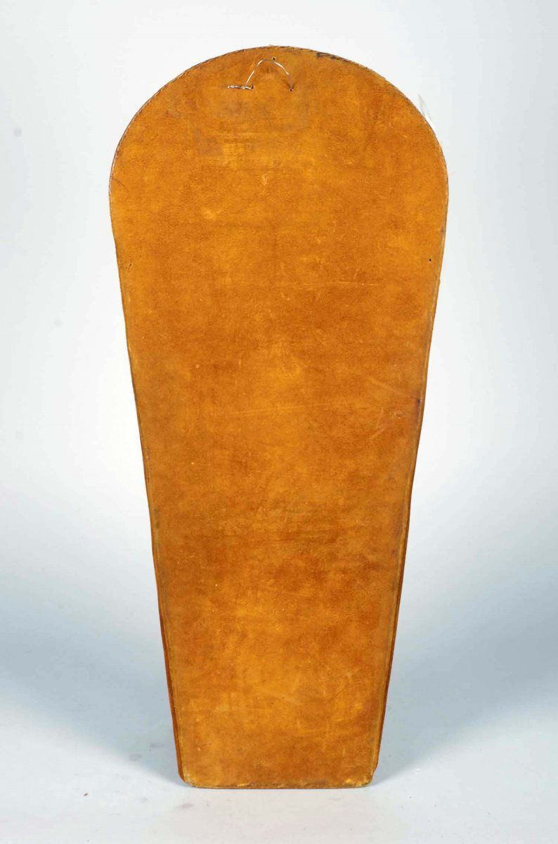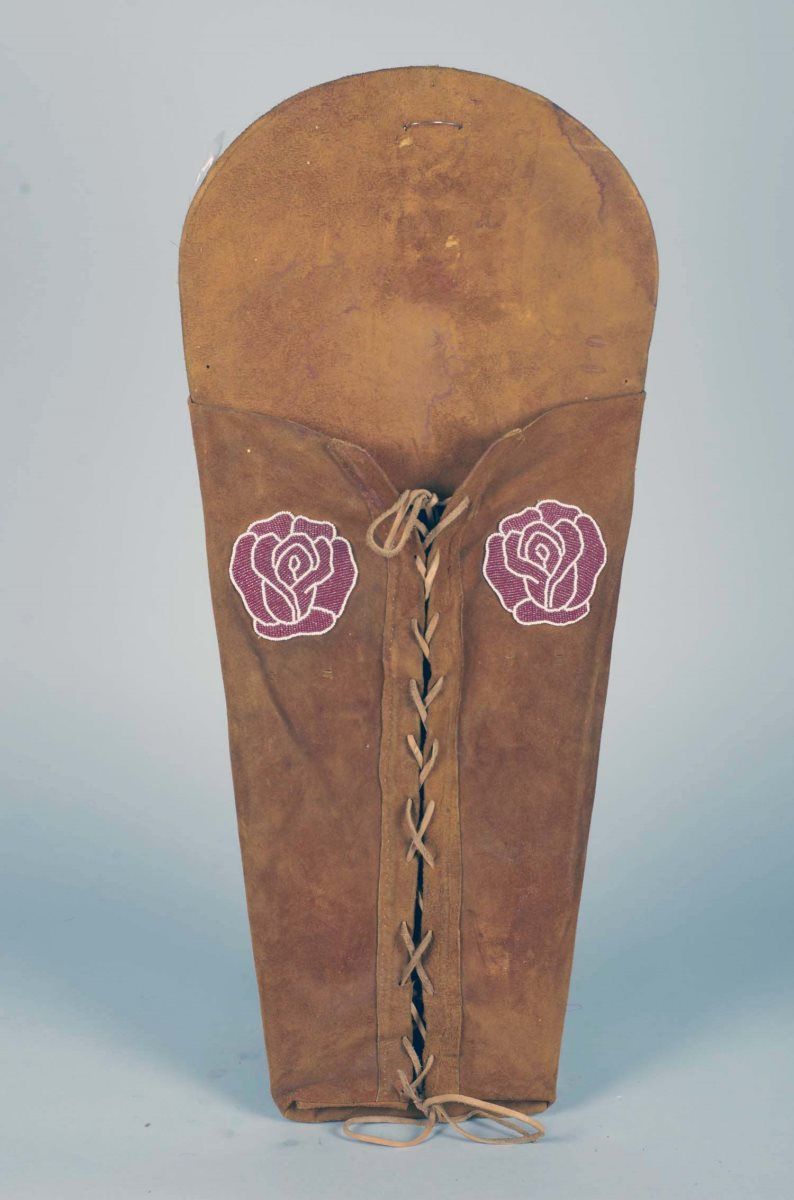 Laced brown suede papoose with red and white beaded roses designed to hang on the wall with Native American styling. Condition (Good). Size 14" x 32"