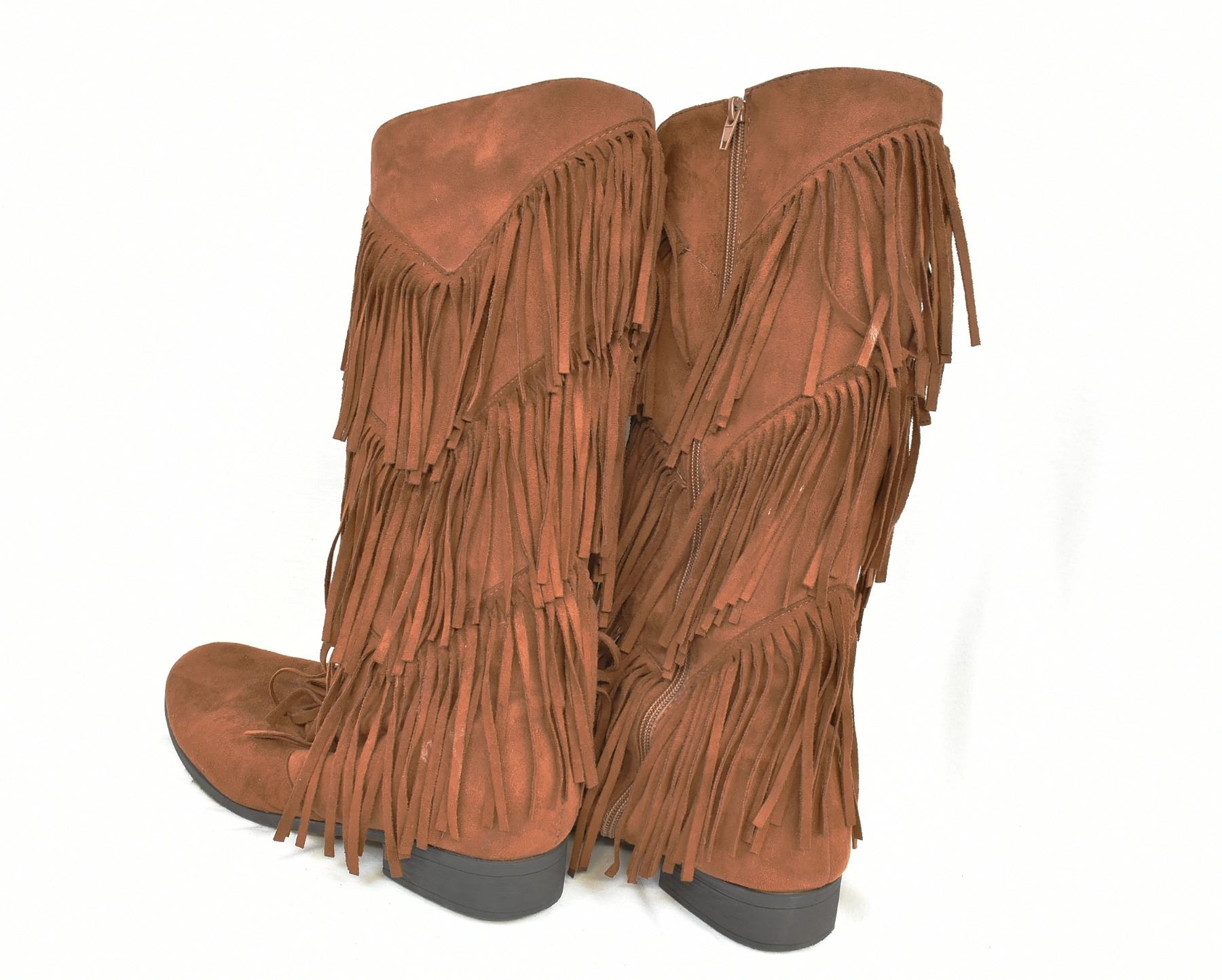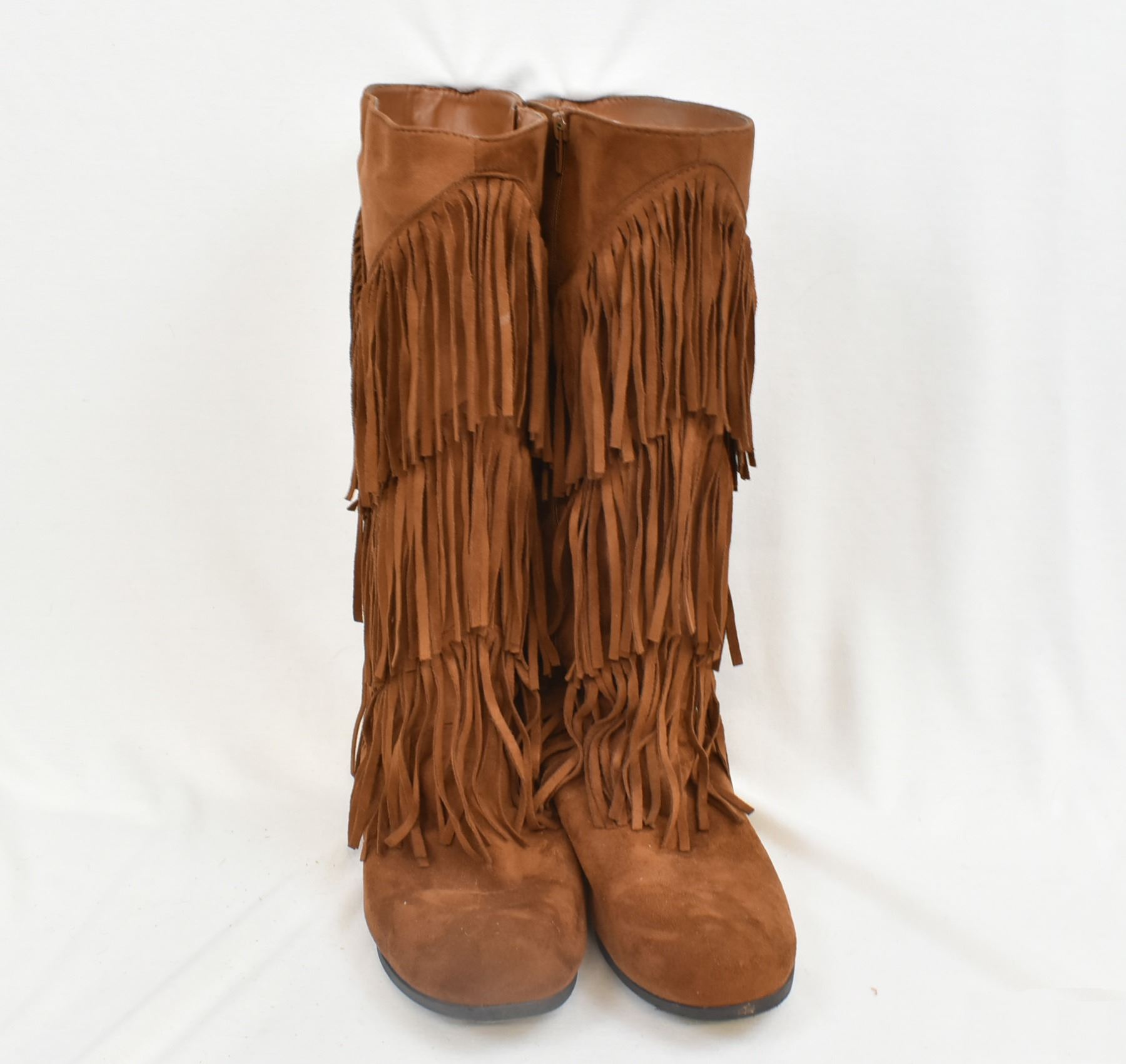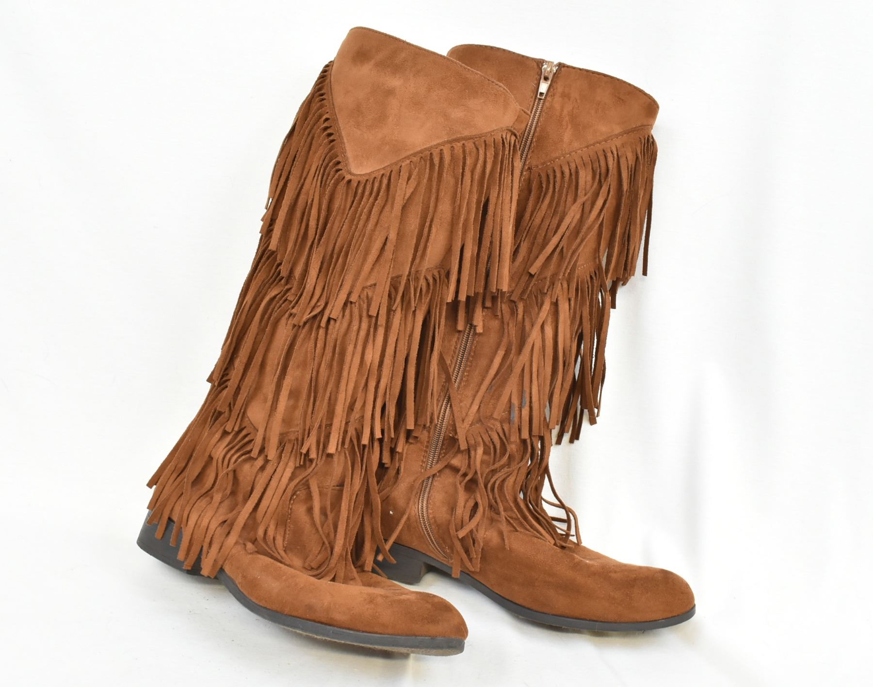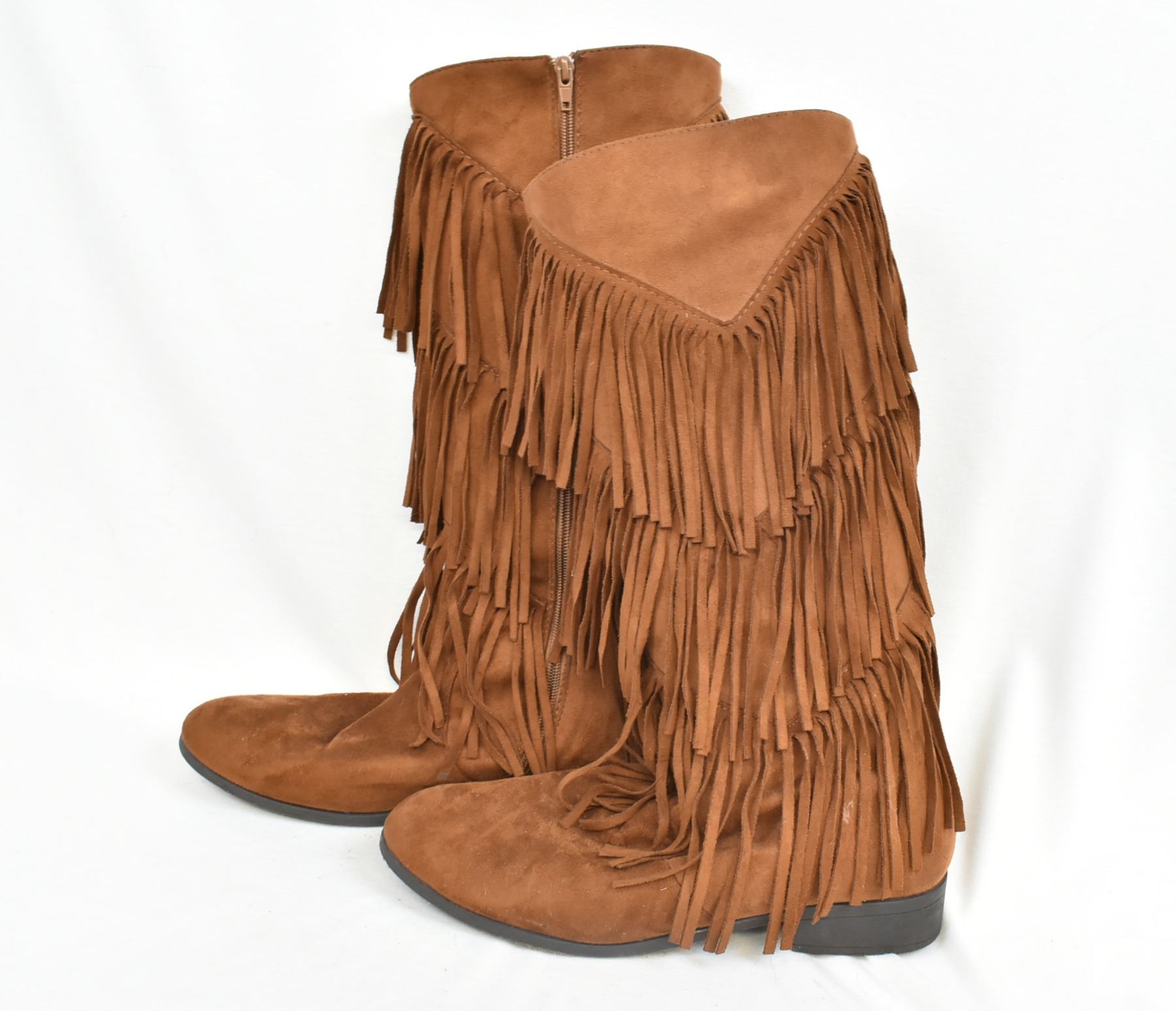 Suede Like Fringed High Top Boots, Size 10M, measures 16''H from bottom of heel to top of boot, made from all man made materials