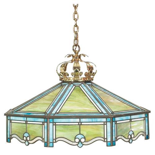 Suess chandelier, attribution, octagonal Prairie School design in blue, green and white glass with original brass fitter and chain, several breaks,27in.w x 40in.h,very good condition