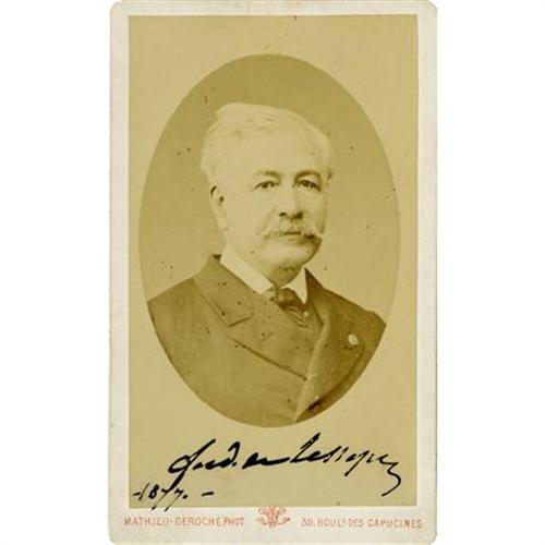 <B>Suez Canal Diplomat Ferdinand de Lesseps <I>Carte-de-Visite</B></I></B></I> <B>Signed</B></I> “<I>Ferd. de Lesseps 1877</B></I>”. 2.5” x 4”, Mathieu-Deroche, Paris studio backmark, image slightly faded, else very good. Ferdinand de Lesseps successfully negotiated the construction of the Suez Canal and initiated the work on the Panama Canal. <BR><BR><b>Shipping:</b> Flat Material, Small (<a target="_blank" href="http://www.heritageauctions.com/common/shipping.php">view shipping information</a>)