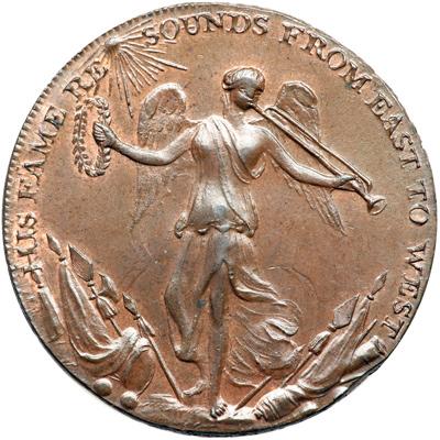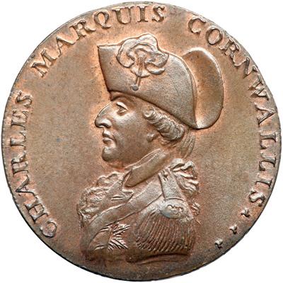Suffolk. Bury. Penny, 1794. D&H-4. Edge: VALUE ONE PENNY AT P. DECKS POST OFFICE BURY 1794. Bust of Charles Marquis Cornwallis to left in cocked hat. Reverse: Figure of Fame, standing between implements of war. NGC graded MS-66 Brown.