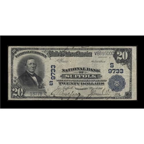 <B>Suffolk, VA</B></I> - $20 1902 Plain Back Fr. 653 <B>NB of Suffolk</B></I> Ch. # (S)9733<BR>This nicely margined <B>Fine+</B></I> presents a very attractive overall appearance, enhanced by the darkly stamped officers' signatures. While by no means a rare bank, it was the only issuer in town.