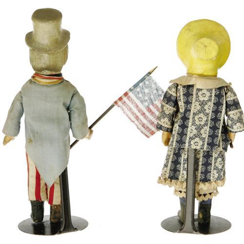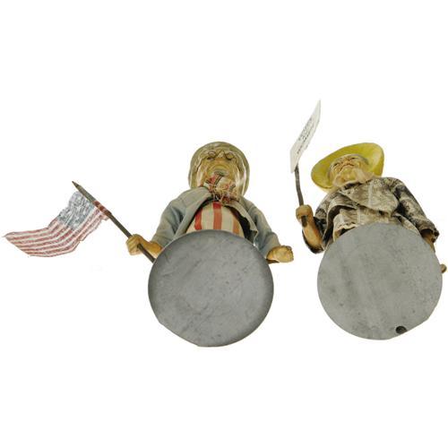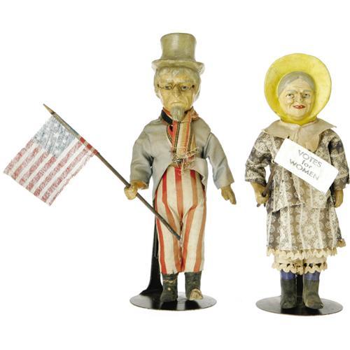 <B>Suffrage and Uncle Sam Patriotic Figures</B></I> made of Papier-mâché. With a cartoon likeness similar to that of Susan B. Anthony, the Suffragette carries her sign reading "Votes for Women". Uncle Sam with a stern look is holding the American flag. Both dolls, although unmarked, were made by the same manufacturer and are 9" tall. The clothing on both, although faded, is intact with the only significant damage attributed to Uncle Sam's foot which has been broken at the toes. These figures are very detailed and a pair we have never seen before.