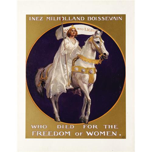 <B>Suffragette Inez Milholland Boissevain Poster.</B></I> Dressed in white and riding a white horse, carrying a banner representing the Suffrage effort, Ms. Boissevain led the "Great Suffrage Procession" in Washington, D.C. on March 3, 1913, where 8,000 women marched for Suffrage the day before Woodrow Wilson's inauguration. An active Suffrage speaker and advocate, Inez collapsed and died while speaking in Los Angeles about Suffrage. Her last words were, "How long must women wait for liberty?" The poster was produced by Alice Paul's National Woman's Suffrage Party to raise funds and commemorate Boissevain's ride through Washington and fateful death. This poster is in excellent condition with some minor edge wear and dirt. It is printed on heavy card stock and is 9" x 11". Gorgeous color and an inspiring graphic to women of the movement.