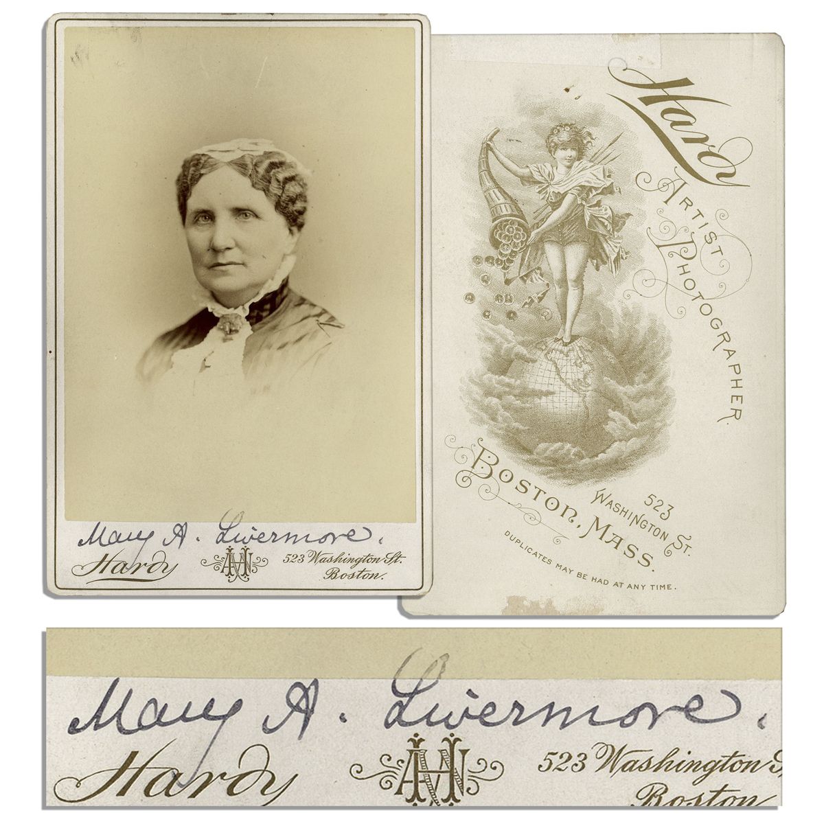 Cabinet card signed by the 19th century suffragette, ''Mary A. Livermore'' With photographer's mark, Hardy of Boston, on mount. Measures 4.25'' x 6.5''. Slight scuffing to surface, and mounting remnant on verso, else near fine.