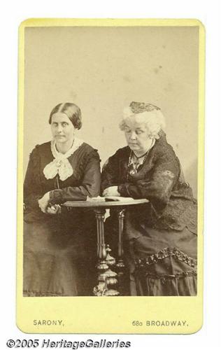 <B>Suffragettes Elizabeth Cady Stanton and Susan B. Anthony Carte de Visite</B></I> Two great Suffragettes, Elizabeth Cady Stanton and Susan B. Anthony, in a pose by Sarony. The back of the board is slightly thinned from removal from an album. As is the case with numerous other cartes presented here, the backstamp of the famous collector Henry Porter is present. His collection constituted a major archive; duplicates, as is the case here, were deaccessioned from the New York Public Library twenty years ago. A lovely study with rich tone and detail. Lot:261