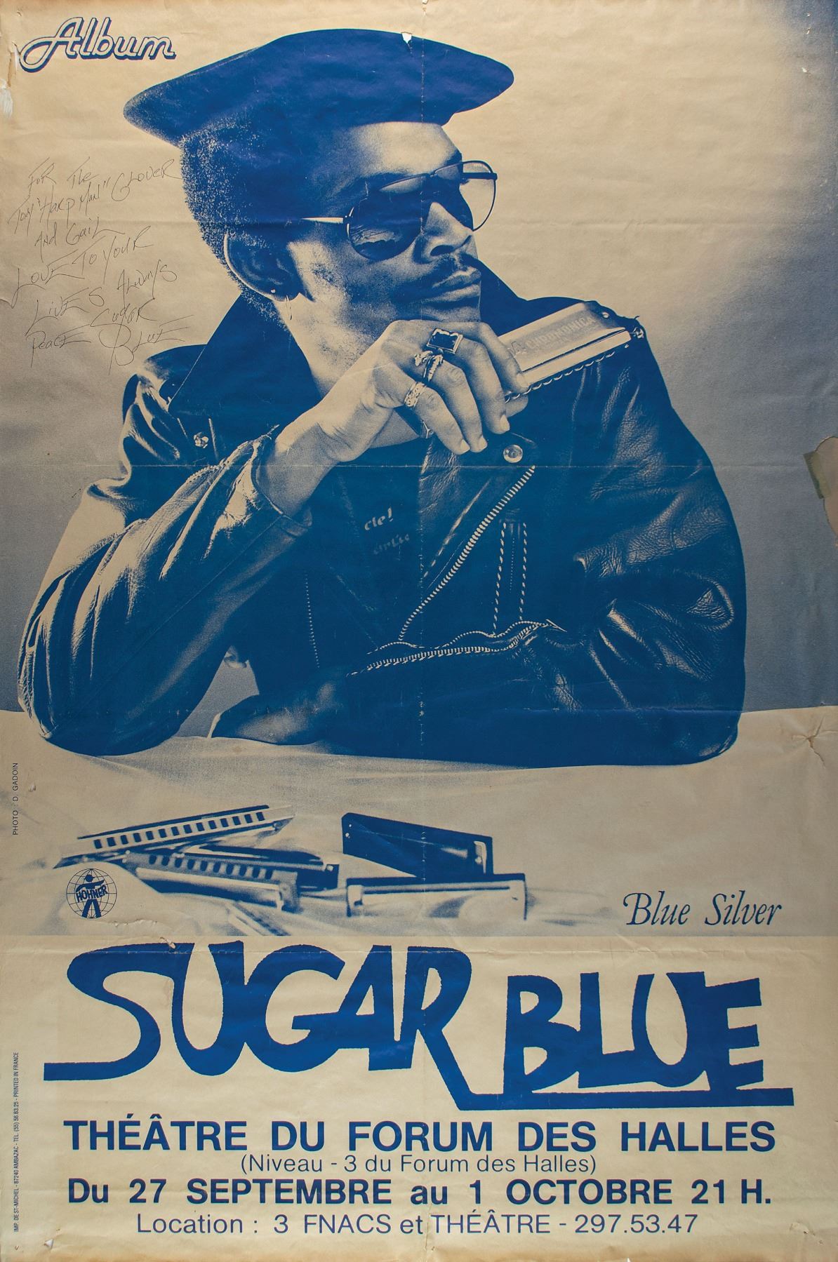 Original 30.5 x 45.5 concert poster for Sugar Blue at the Theatre du Forum des Halles in Paris, signed and inscribed in black ballpoint, "For Tony 'The Harp Man' Glover and Gail, Love to Your Lives Always, Peace, Sugar Blue." Also includes two audio cassette tapes of Tony Glover's interviews with Sugar Blue, dated January 14, 1984, and September 27, 1991. In overall good to very good condition, with intersecting folds and crude repairs to paper loss along the edges of the poster. A great show of one respect from one master of the blues harmonica to another. Glover once wrote of Sugar Blue: 'Indescribable may be the best adjective for Blue's harmonica playing—there's simply nobody else with whom to compare his soaring chops. He takes the blues harmonica well inside the realm of a lead instrument, wringing from it lightning riffs and subtle intonations.'