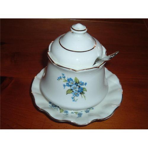 MAKE OFFER! SHIPPING FREE WITHIN U.S. Adorable complete covered sugar bowl set with sugar bowl, lid, saucer, and spoon; handpainted blue and green floral pattern accented with gold trim.