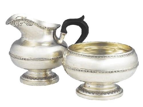 Silver, 572 g. Round base, bellied bowl, rolled decoration. Milk jug with wooden handle, acanthus leaves on the spout. Marked: Vienna, circa 1880, Franz Rumwolf. Neuwirth: II/167. Size: 8 and 12 cm
