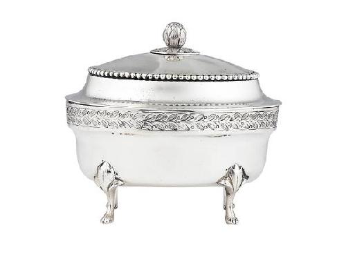 Silver, 379 g. Stylised, cast feet, oval, bellied bowl. Matted laurel wreath on the rim. Detachable, shaped, domed cover with beaded decoration and cast, bud form final. Marked: Pest, between 1792 and 1797, L year letter, Müller Antal. Brestyánszky: 119, 199, 272. Size: 12 x 13 x 9.5 cm