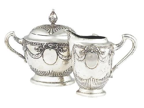 Silver, 422 g, gilt interior. Oval form, pressed ribbon-garland decoration. Marked: German, late 19th century. Size: 14.5 and 11.5 cm