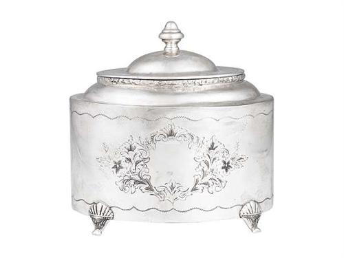 Silver, 403 g. Oval form raised on for cast supports, hinged cover. Engraved floral decoration on the surface. Marked: German, 800 fineness, late 19th century. Size: 13.5 x 11 x 14 cm