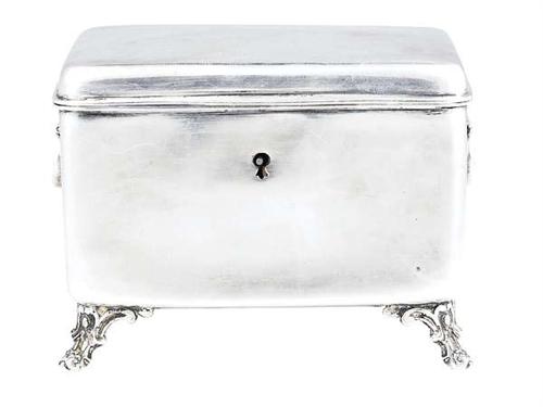 Silver, 498 g, gilt interior. Rectangular form raised on four cast supports. Hinged cover, flanked by handles. Marked: Austrian, late 19th century, Josef Lechner. Neuwirth: II/21. Size: 14.5 x 9 x 11 cm