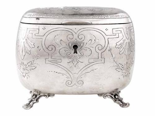 Silver, 452 g. Raised on four cast legs, engraved by machine – amorettes and engraved initials on the cover. Marked: Austrian, circa 1880, Hermann Südfeld. Neuwirth: II/240. Size: 14 x 10.5 x 11.5 cm