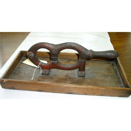 Sugar Cane chopper mounted on old stand ca. mid 19th century. Heavy cast iron chopper has blade in center and round elements on either side to hold the cane before and after chopping. Chopper including handle 15 inches long and 6 inches at arches over rounded elements. Heavy Chopper is Screwed to wooden base with sides 1-1/4 inch all around. 20-1/4 by 9-3/8 inches. Came from Aiken, SC collection of plantation items.