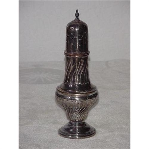 A reproduction of an antique sugar caster, 8" tall, this one is made in England by William Adams. This is used to shake powdered sugar on cakes or fruit or anything you want to sweeten. Silver on copper, it will polish up beautifull with a hint on the copper showing at the neck. A beautiful appointment for your table.