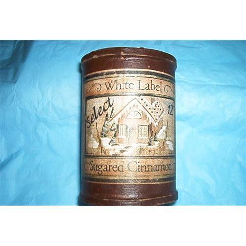 The name brand of the sugared-cinnamon container is White Label. There is a picture of a winter scene: House, Snow, and Pine Trees and SELECT. The price for this sugar-cinnamon years ago was only 12 cents. The cardboard container is 4 1/8 inches tall and 3 inches in diameter. A beautiful reproduction of the original. The oval carboard lid has (on the inside) Heart & Home.