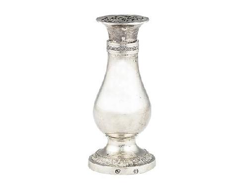 Silver, 64 g. Round, rolled base, pear shape body, pierced and chiselled screw-cap with floral decoration. Marked: Vienna, first half 19th century, L. T. maker’s mark. Size: 9 cm