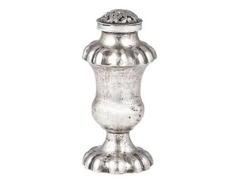 Silver, 85 g. Round, fluted base. Vase form body. Engraved and pierced cap. Marked: Locse, first half 19th century, Alexander BartscLength Size: 13 cm