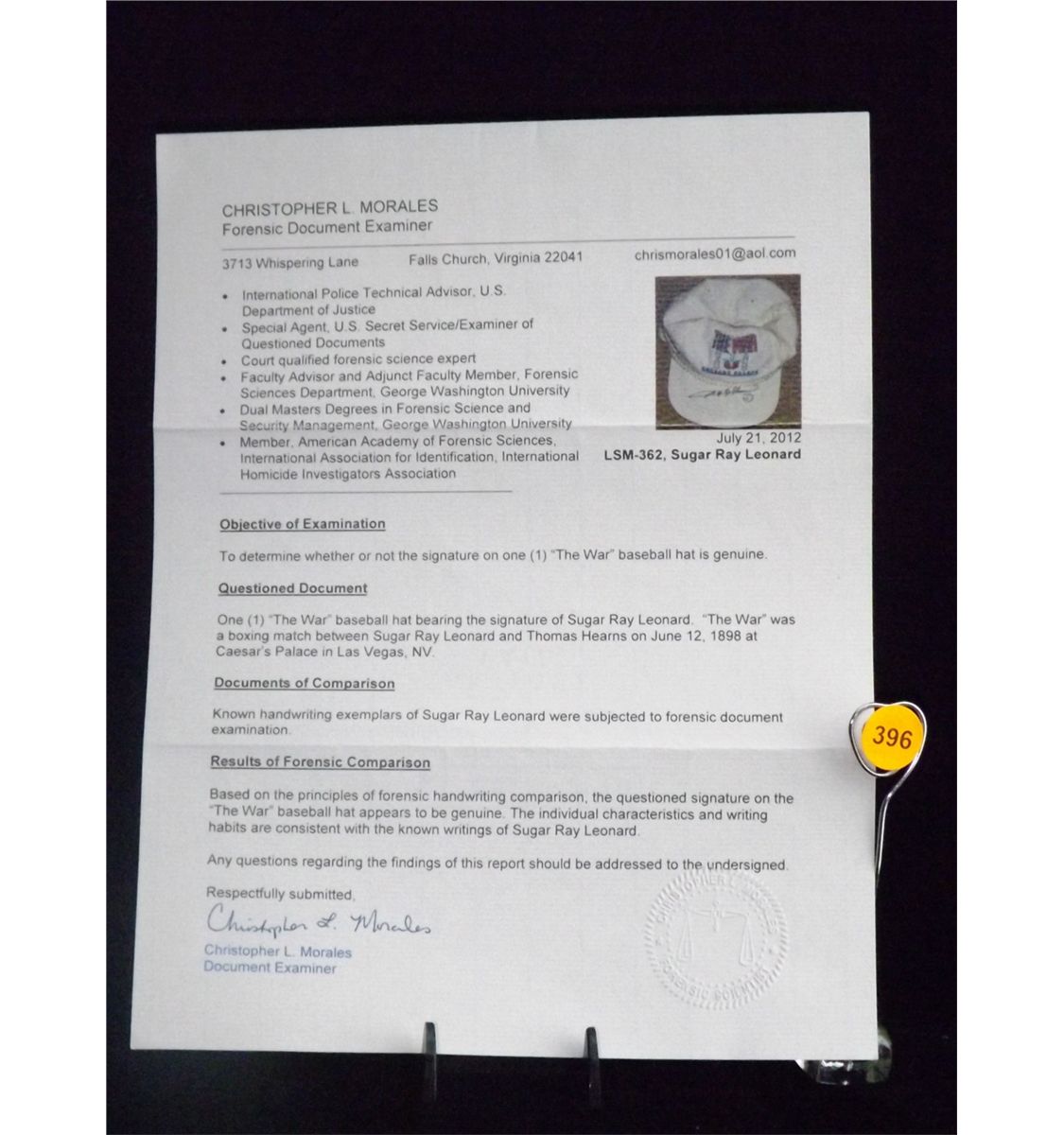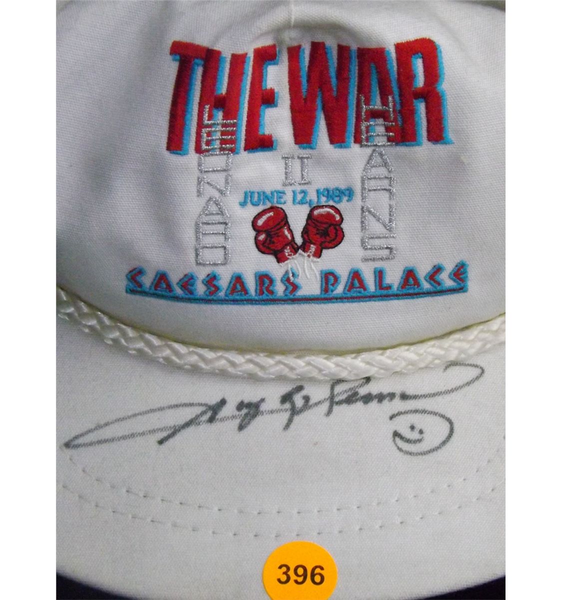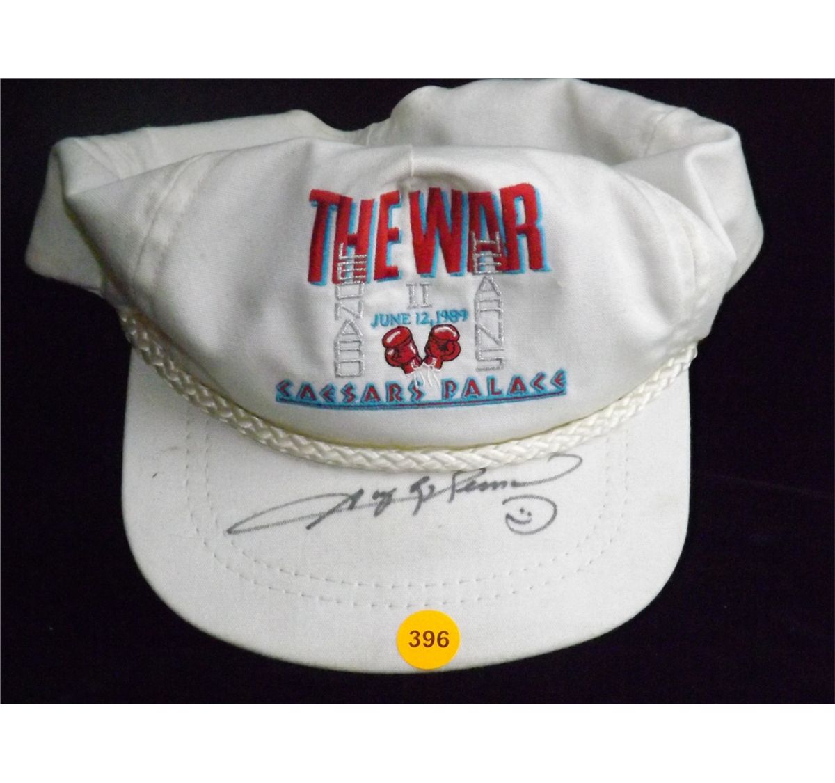 Sugar Ray Leonard Autographed Hat. '"The War" Leonard-Hearns June 12, 1989 Caesars Palace' Hat. Appraised or estimated retail value $1250. COA by Christopher Morales. All Sales Final. Please see terms and conditions of auction.