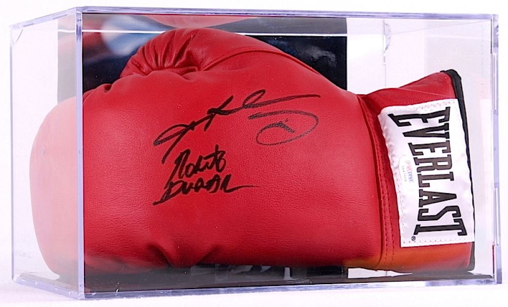 Everlast boxing glove. Hand-signed in black felt-tip pen by Sugar Ray Leonard and Roberto Duran. The auction includes the display case shown in photos. Also includes an 8" x 10" photo of Sugar Ray Leonard and Roberto Duran that is included inside the case. Please note that the case has been damaged. See photos for details. The autograph includes an official PSA/DNA hologram and matching COA for authenticity purposes. The signing of this item was witnessed by PSA.