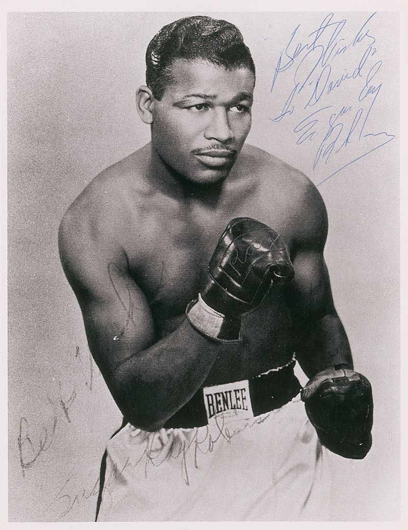Glossy 8 x 10 photo of Robinson in a pugilistic pose, signed and inscribed in blue ballpoint, “Best wishes to ‘David’ Sugar Ray Robinson.” In fine condition, with some scattered light creases to left side and a light signature inherent to original photo.