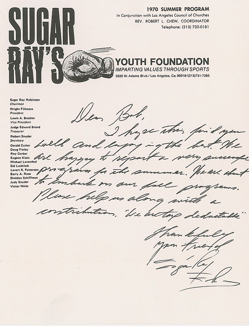 Uncommon ALS, one page, 8.25 x 11, Sugar Ray’s Youth Foundation letterhead, no date, but postmarked September 18, 1970. Letter to a contributor. In full: “I hope this finds you well and enjoying the best. We are happy to report a very successful program for the summer. We are about to embark on our fall programs. Please help along with a contribution. ‘We are tax deductible.’” In fine condition. Accompanied by the original mailing envelope addressed in Robinson’s hand.
