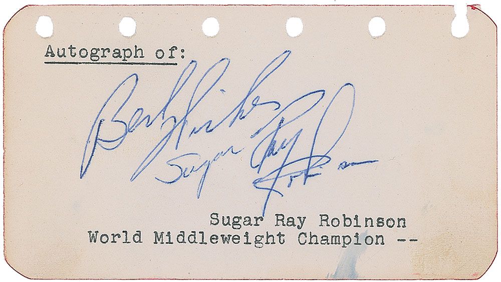 Vintage ballpoint signature, “Best wishes, Sugar Ray Robinson,” on an off-white 4.5 x 2.5 page. In fine condition, with a bit of light edge toning.