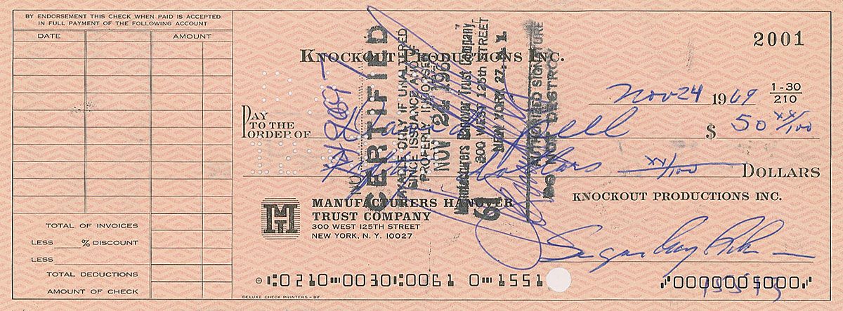Knockout Productions, Inc., business check, 8.25 x 3, filled out and signed by Robinson, payable to David L. Pell for $50, November 24, 1969. In fine condition, with overwhelming central bank stamps and notations affecting the main writing, and a cancellation punch below the signature; signature area remains clean and unaffected.