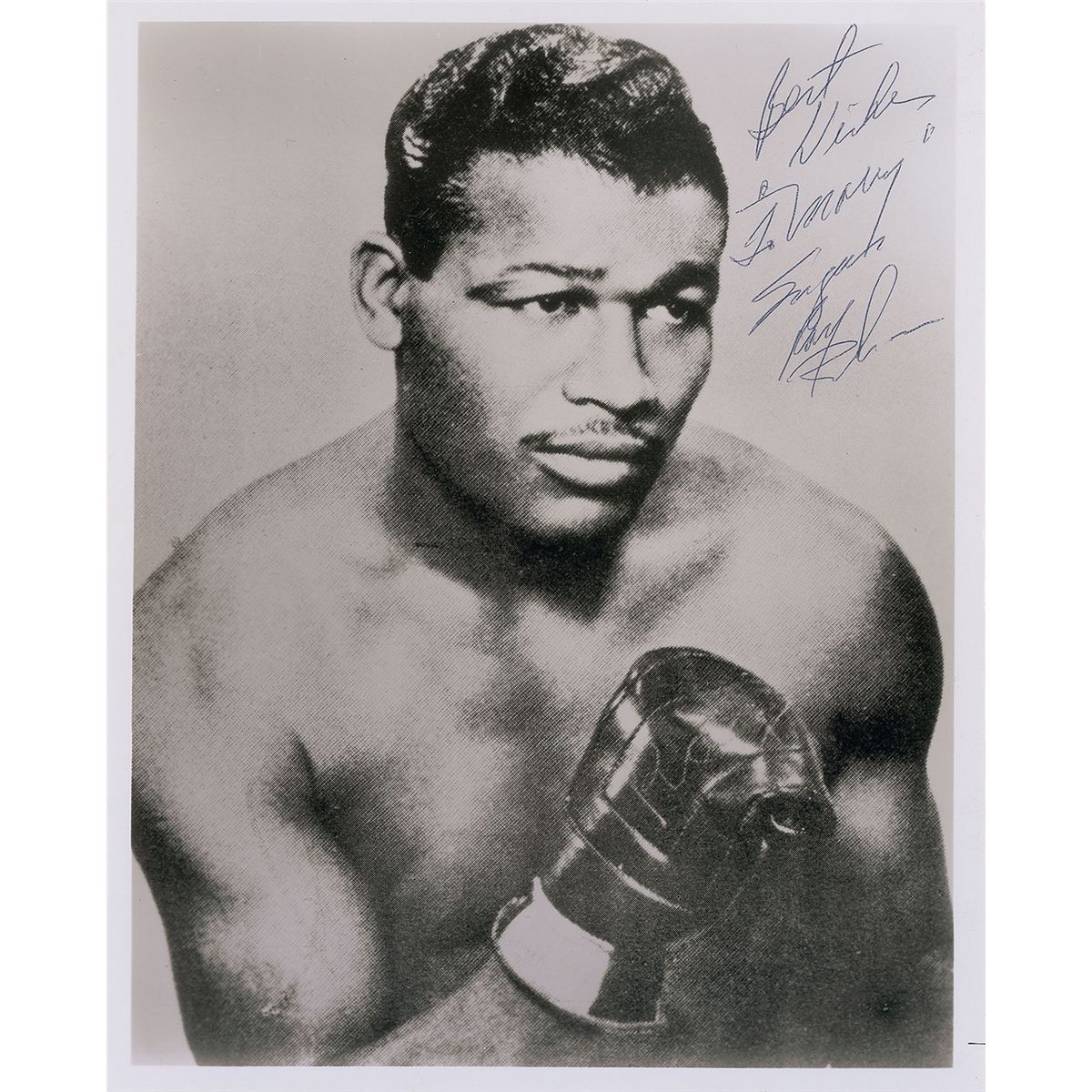Glossy 8 x 10 photo of Robinson with his fist up, signed and inscribed in black ballpoint, “Best wishes to ‘Mary,’ Sugar Ray Robinson.” In fine condition.