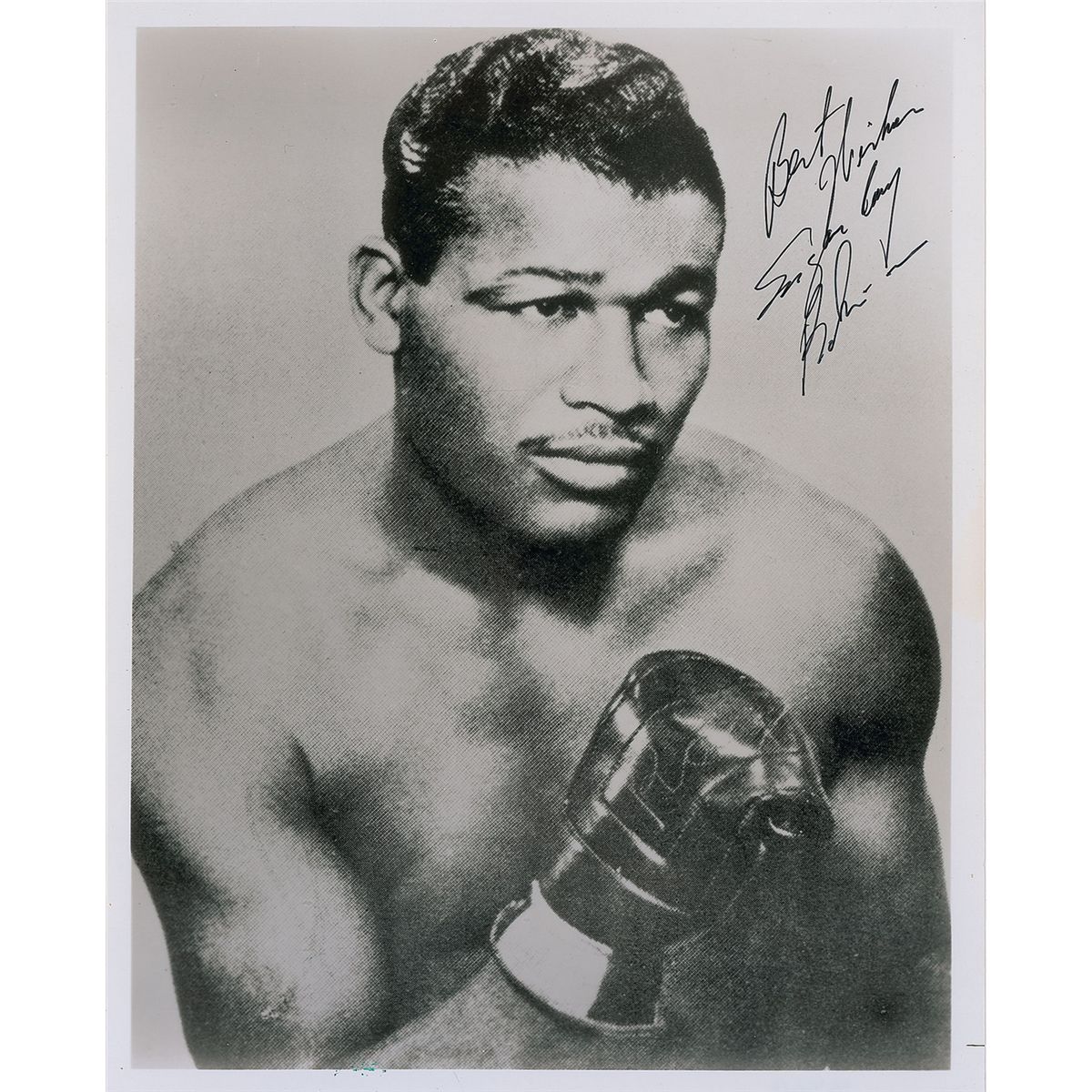 Glossy 8 x 10 photo of Robinson with his fists up, signed in black felt tip, “Best wishes, Sugar Ray Robinson.” In fine condition.