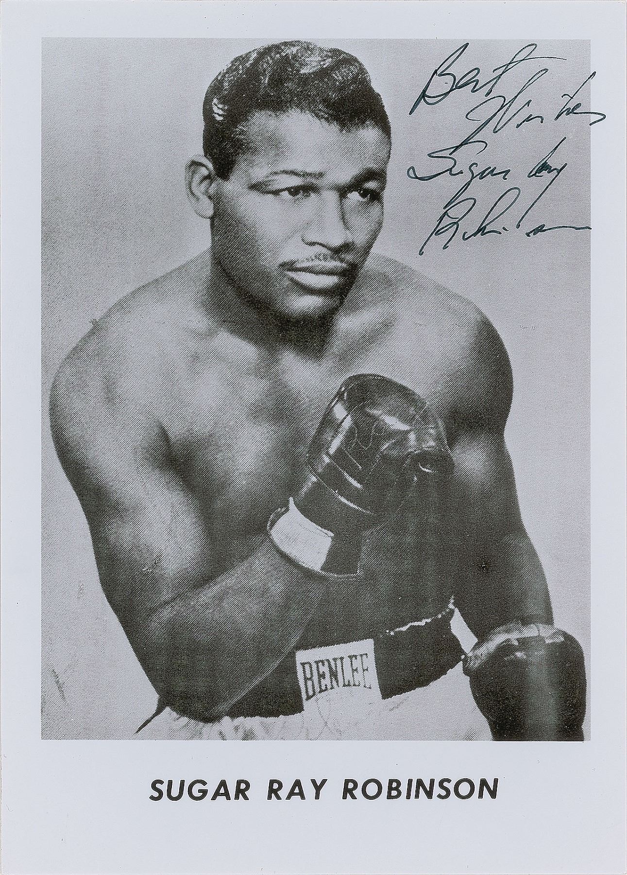 Glossy 5 x 7 promotional photo of Robinson in a half-length boxing stance, signed in black ink, "Best wishes, Sugar Ray Robinson." In fine condition.