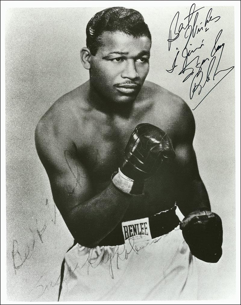 Glossy 8 x 10 photo of Robinson in his prime, signed and inscribed in black felt tip “Best wishes to ‘Jim’ Sugar Ray Robinson.” In fine condition, with some scattered light creases and surface marks, and a light signature inherent to original photo. Pre-certified Steve Grad/PSA/DNA and RRAuction COA.
