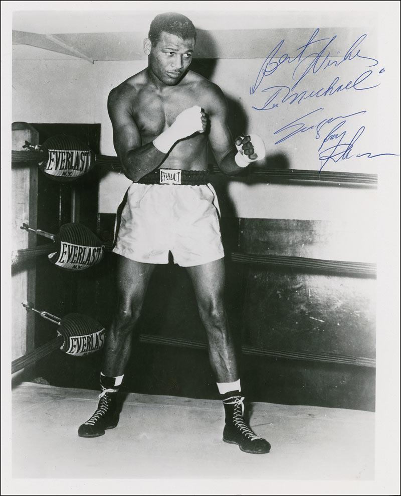 Glossy 8 x 10 full-length photo of Robinson in the ring, signed and inscribed in blue ballpoint “Best wishes ‘To Michael’ Sugar Ray Robinson.” In fine condition, with a few light bends and surface marks.