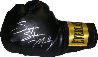 Sugar Shane Mosley has held world titles in three weight divisions, having held the IBF lightweight title, Lineal, WBC, & WBA(Super) welterweight titles, and Lineal, WBC, WBA(Super), & The Ring light-middleweight titles. On June 4, 2012, Shane Mosley officially announced his retirement from boxing. He finished his boxing career with 46 victories, 8 defeats and 1 draw. He knocked out 39 of his opponents. Sugar Shane Mosley has hand signed this Black Everlast Left Boxing Glove (14 oz). Leaf Authentics Hologram and Certificate of Authenticity from Athlon Sports.