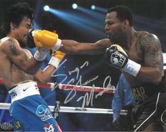 Sugar Shane Mosley has held world titles in three weight divisions, having held the IBF lightweight title, Lineal, WBC, & WBA(Super) welterweight titles, and Lineal, WBC, WBA(Super), & The Ring light-middleweight titles. On June 4, 2012, Shane Mosley officially announced his retirement from boxing. He finished his boxing career with 46 victories, 8 defeats and 1 draw. He knocked out 39 of his opponents. Sugar Shane Mosley has hand signed this Boxing 8x10 Photo vs Manny Pacquiao. Leaf Authentic Hologram and Certificate of Authenticity from Athlon Sports.