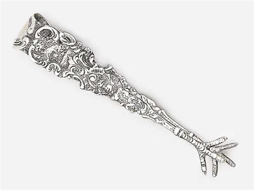 Silver, 32 g. Cast, neo-rococo decoration on the handle, claw form tongs. Marked: German, 800 fineness, late 19th century, Hungarian import mark. Length: 11 cm