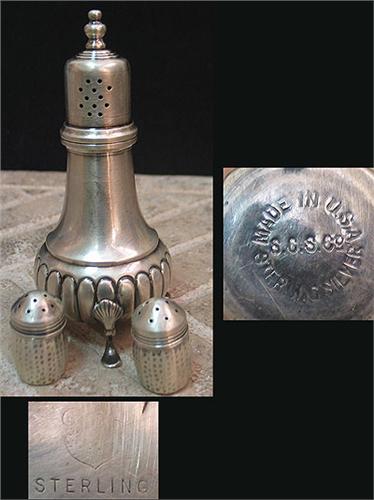 Sugar shaker standing 5 1/2" tall and two individual salt and peppers total 3oz sterling. No monograms
