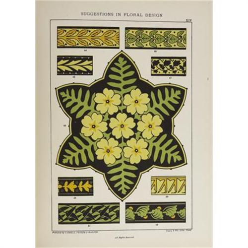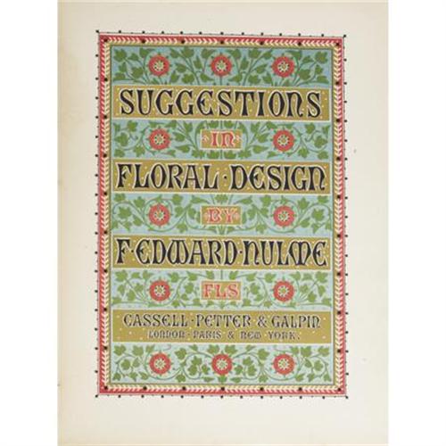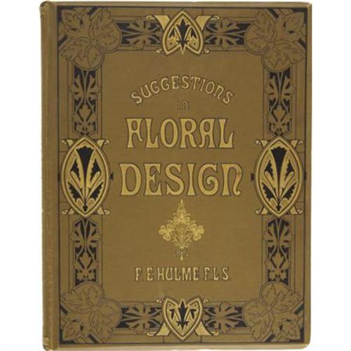 <B>F[rederick] Edward Hulme. </B></I><B><I>Suggestions in Floral Design</B></I></B></I><B>.</B></I> Fifty-two Coloured Plates. London, Paris & New York: Cassell Petter & Galpin, [n.d., 1878?]. <BR>Large quarto (14.125 x 10.9375 inches). 52 pages. Title printed in red and black. Fifty-two chromolithographed plates, including added title and end leaf, with guard sheets. The plates are beautifully printed in gold and colors by Dupuy & Fils, Litho., Paris.<BR><BR>Original olive fine diagonally-ribbed cloth over bevelled boards with front cover decoratively stamped and lettered in gilt and black, spine decoratively stamped in gilt and black and lettered in gilt, and back cover decoratively stamped in blind. All edges gilt. Black coated endpapers. Extremities lightly rubbed, with cloth beginning to fray in a few places, lower board edges lightly bumped, a few small areas of discoloration to cloth on rear cover. The hinges are cracked and a few leaves are loose, but the plates are generally clean and bright, with only minimal foxing or occasional thumb-soiling. A few tissue guards with small tears.<BR> <BR>"The greater number of the illustrations have already been privately used as indications to pupils of what we consider correct treatments of floral forms, and it is in the hope that they may be thus useful to a larger circle that they are now published. To this end they have all been kept bold in form, simple in colour, and of a size that should present no difficulties to any student desirous of reproducing them; and we may further mention that none of the suggestions are mere reproductions or modifications of designs that have already done service commercially. All have been prepared for the special purpose of this work" (p. [3]).<BR><BR><b>Shipping:</b> Books & Catalogs (<a target="_blank" href="http://www.heritageauctions.com/common/shipping.php">view shipping information</a>)