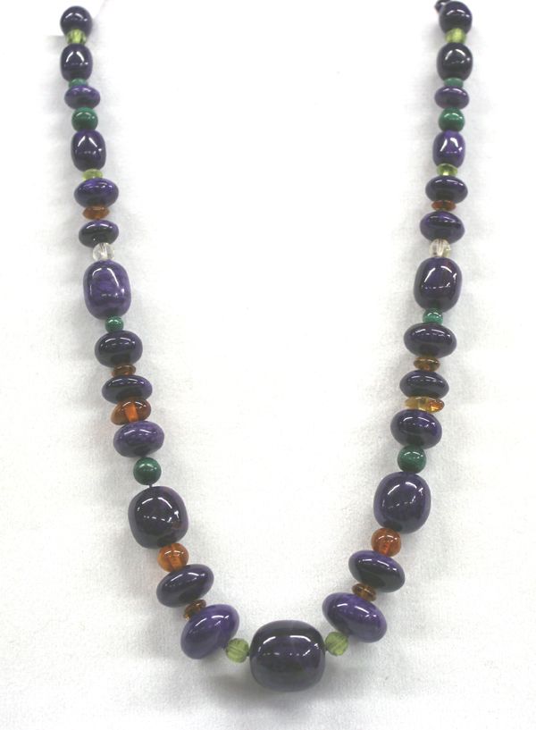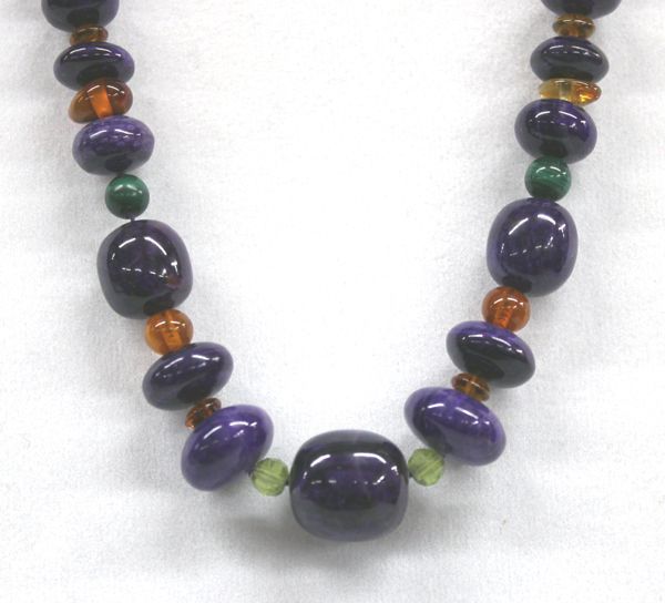 Beautiful Sugilite Necklace with Faceted Crystals and Malachite Beads, measures 16'' end to end, 14Kt Gold Clasp, largest bead measures .5''D