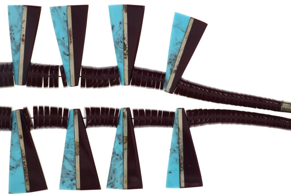 This lot features a true master piece, this "Pharaoh" necklace in Sugilite, Turquoise and Sterling Silver collected from David Saity, New York, New York in the 1990s. The piece is very similar to work by Andy Lee Kirk (Dine-Isleta, 1947-2001) who was known to work in Sugilite. The necklace is reversible, meaning it can be worn on the sugilite only side or the sugilite, turquoise and sterling side. David Saity was a dealer in high-end Native American jewelry in the 1990s in New York City. The necklace exhibits a discoidal graduated necklace in rare deep purple Sugilite with eleven gorgeous wedge shaped pendants which show sugilite on one side, a band of sterling silver down the center, and turquoise on the other (the bottom piece having turquoise on both sides). The sugilite appears to be "reconstituted" not raw stone, but Mr. Saity assured the purchaser that it was indeed sugilite. The top has long tapering sterling silver hairpipe cones with a sterling silver clasp. This is likely from a master Native American artist, as that was David Saity's specialty. Truly a master piece work of art that would make quite the statement. Purchased for over $5,000 in 1990s from David Saity. Measures overall 24.5"L end to end and the wedge pieces are 1 7/8" by 7/8". Each earring measures 2.75"L by 7/8"W.*