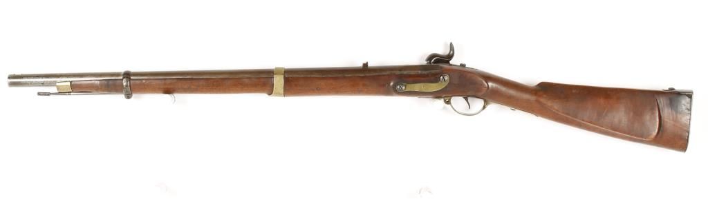Early flintlock to percussion conversion of a German musket. Lock is marked "Suhl", dated 1846, 28" barrel. Approx .75 Cal. Shows good markings. Missing front sight. Stock shows minor losses and cracks. *Antique Firearm*