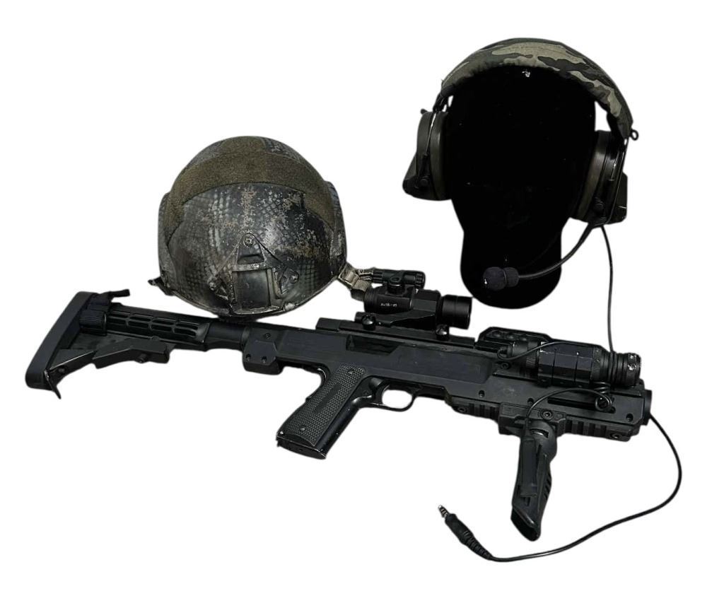 Original set of soldier weapon props used in the production of the superhero film 'Suicide Squad' (2016), based on the DC Comics supervillain team of the same name.