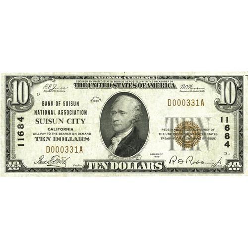 <B>Suisun, CA</B></I> - $10 1929 Ty. 1 <B>Bank of Suisun National Association</B></I> Ch. # 11684<BR>A very tough note from this seldom offered bank which issued Series 1929 examples only. Nice <B>Fine-Very Fine.</B></I>
