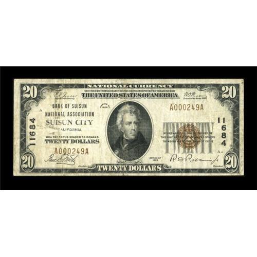 <B>Suisun, CA</B></I> - $20 1929 Ty. 1 <B>Bank of Suisun National Assoc</B></I> Ch. # 11684<BR> The last note from this bank to appear in public auction was in 2006 and realized more $1,150 in approximately the same condition. The paper is solid, though the bank title is a little weak. <B>Fine.</B></I><I><BR>From The Kansas City Collection.</B></I><BR><BR><b>Shipping:</b> Coins & Currency (<a target="_blank" href="http://www.heritageauctions.com/common/shipping.php">view shipping information</a>)