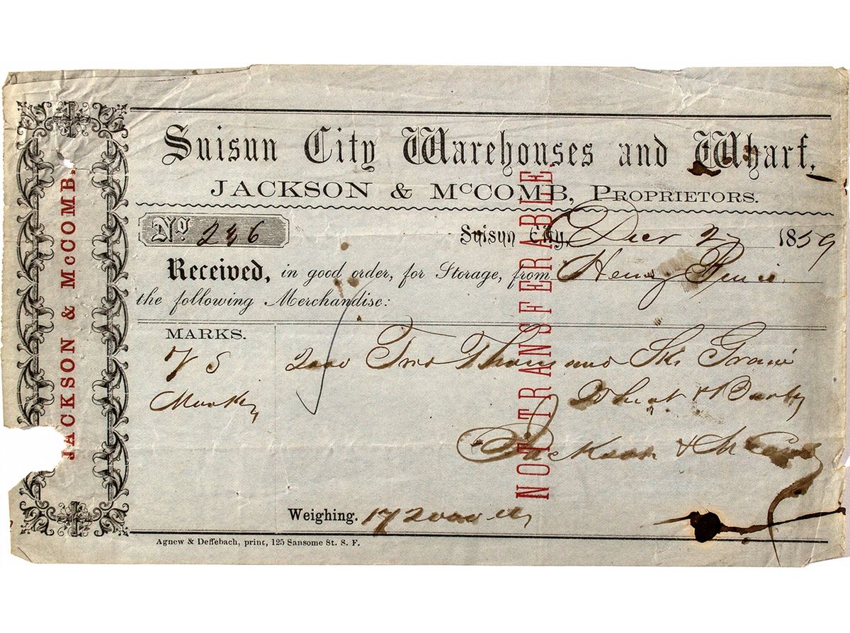 Grain and barley has arrived on the Henry Pru. Jackson & McComb are the proprietors. Schooners were constantly in Suisun Slough headed for San Francisco and Sacramento with their cargo. The buildings in Suisun City indicated its mercantile prosperity. Jackson & McComb were erecting a new two story fireproof brick building at this time.