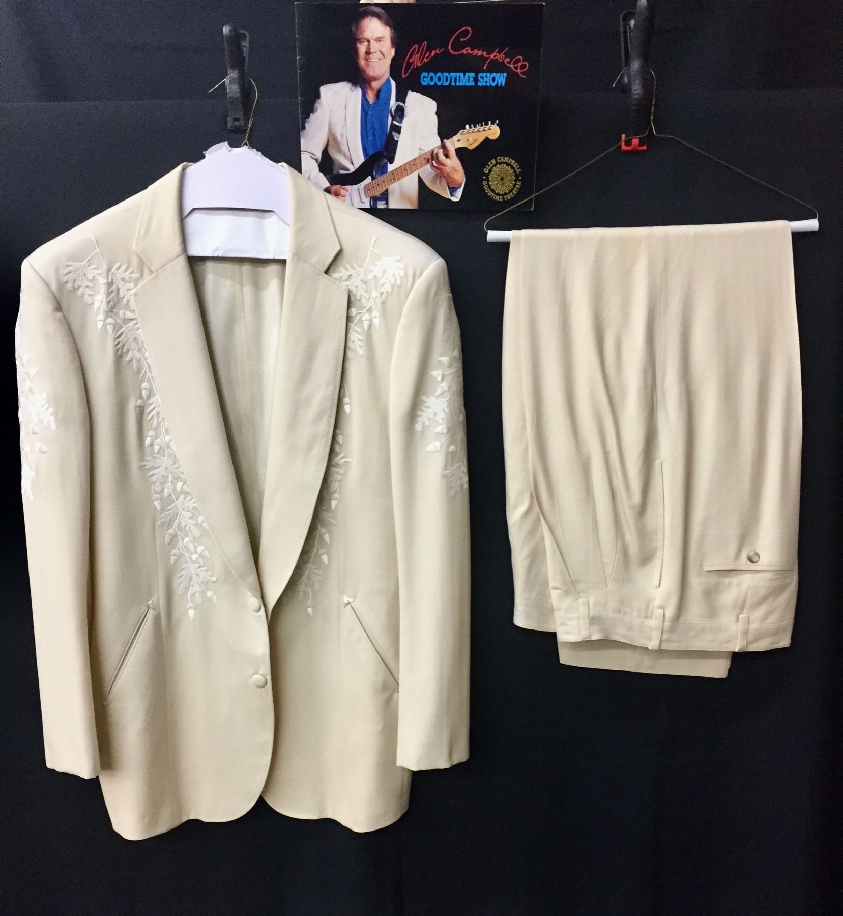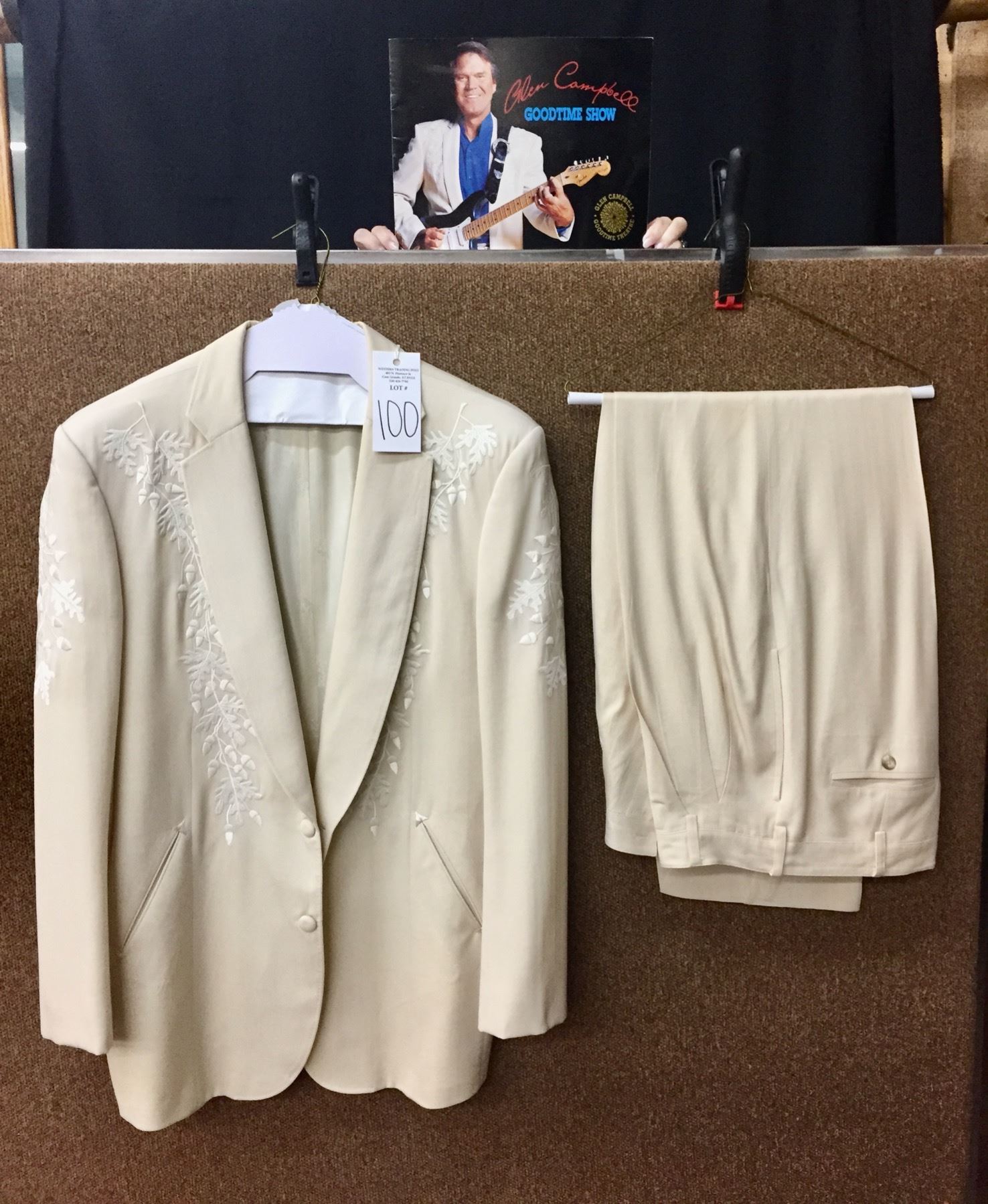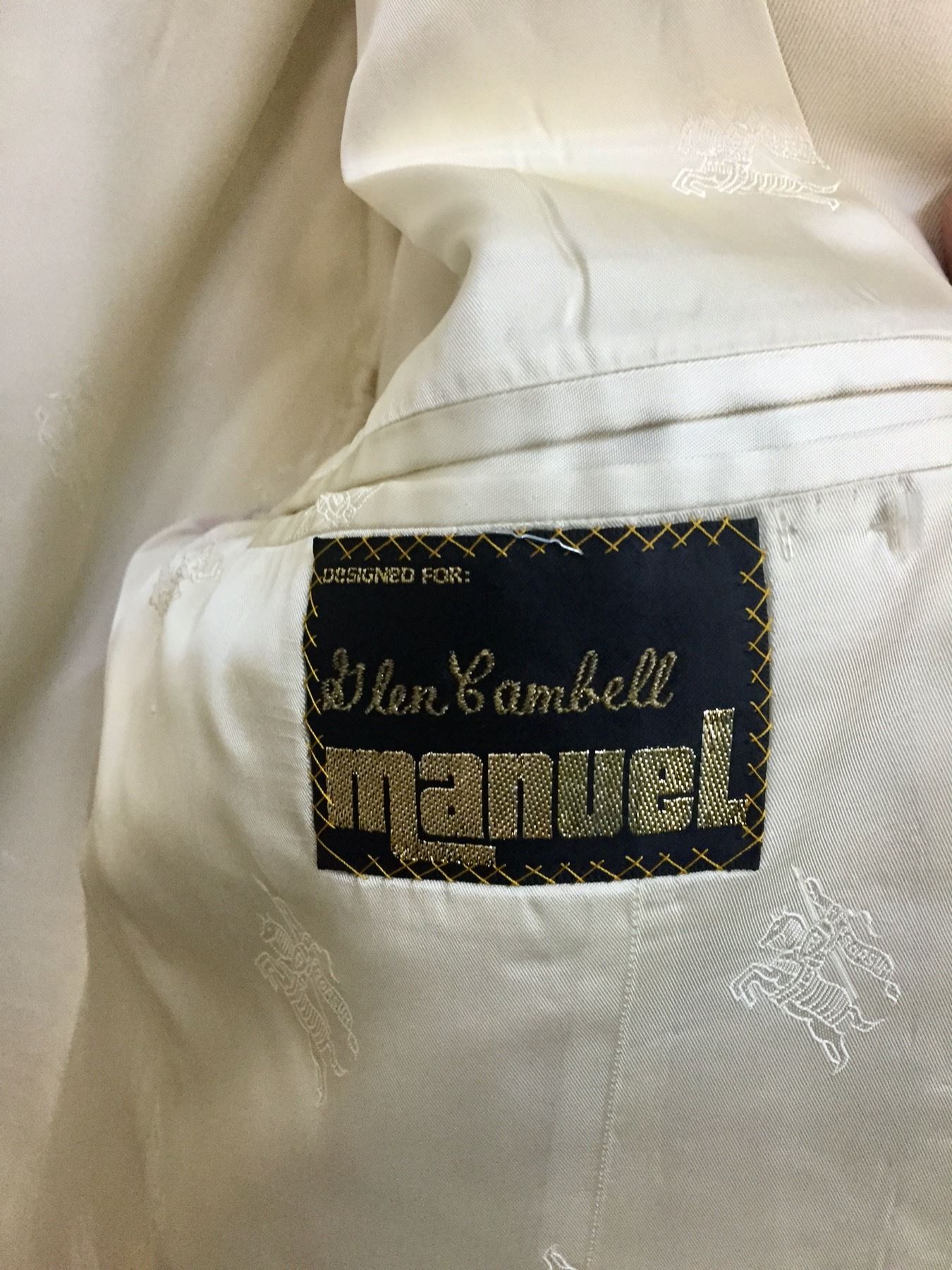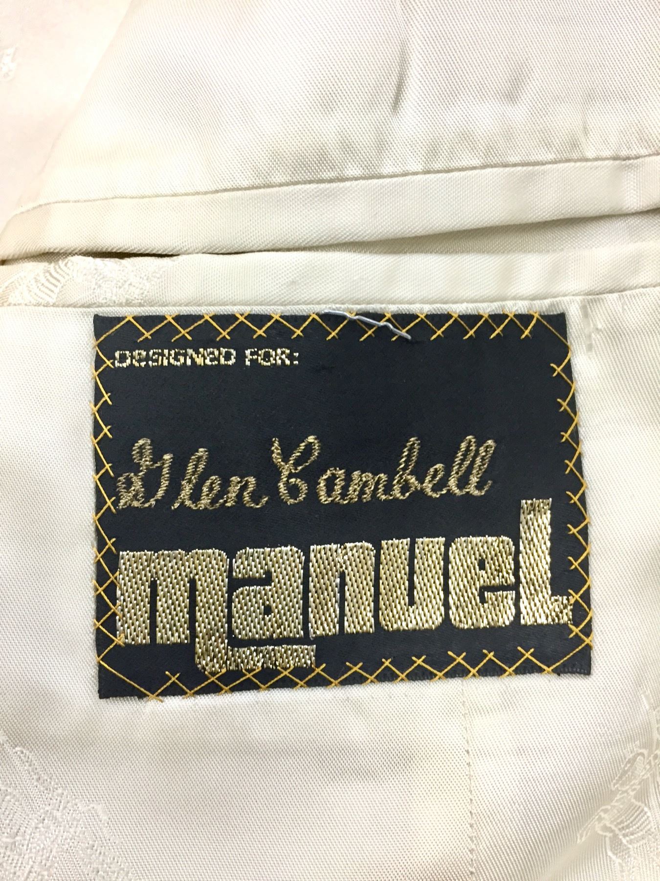 Description: This is a rare opportunity to acquire a suit owned and worn by Glen Campbell. He appeared in this very suit on stage and in promotional materials / brochures on numerous occasions. The off white dress coat has a label inside that says, Designed for Glen Campbell by Manuel. Manuel is know by many as the designer to the stars. It comes with a pair of dress pants by Tommy Bahama. It comes with some of the promotional materials showing the suit being worn by Glen. This suit was a gift from Glen Campbell to one of his band members (Noel Kirkland also pictured and mentioned in the promotional materials). Aside from the photographs, we have a letter of authenticity from Noel Kirkland’s widow testifying to the fact that this is the exact same suit pictured and that it was gifted to her lated husband by Glen Campbell. Maker: Manuel and Tommy Bahama. Approx. Age: Circa 1990s. Size: No size is listed on the Jacket, but Glen was about 6’ tall and of average build. The pants say size 34 on the tag. Condition: Good for its age, normal wear expected. Please look closely at the pictures - they are an important part of our description. Shipping: There will be a $15 handling, packaging fee for shipping this lot. The actual cost of postage will be added on top of that.